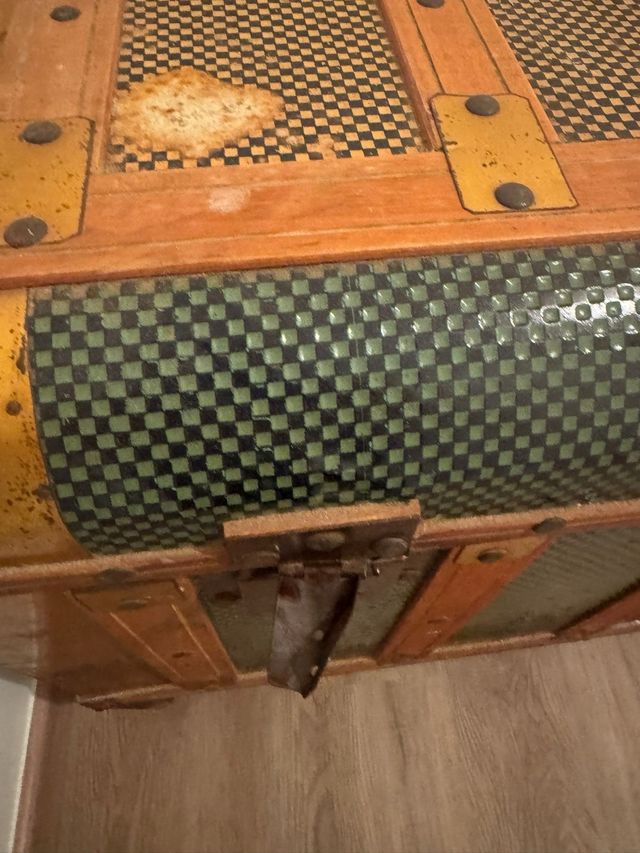 Hecho a mano con estructura de madera maciza, refuerzos metálicos y lona estampada en damero verde y ocre. Su interior conserva el forro floral original típico de los baúles de vapor de principios del siglo pasado.