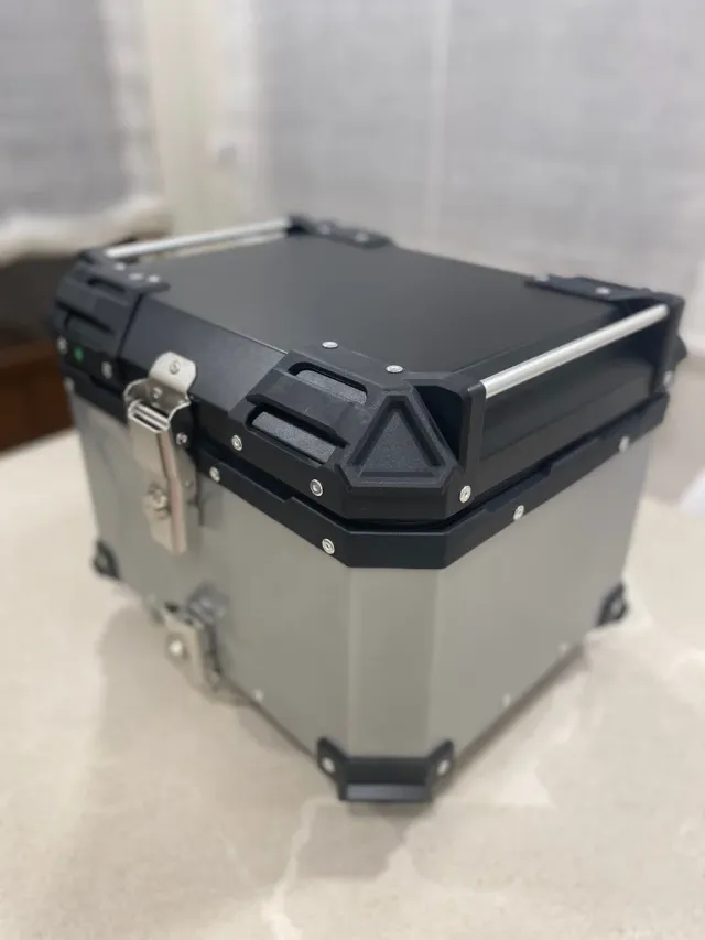 Baúl de aluminio para moto de 45 litros, completamente nuevo. - Material: Aluminio. - Capacidad: 45 litros. - Color: Plateado y negro. Similar a Givi Trekker outback