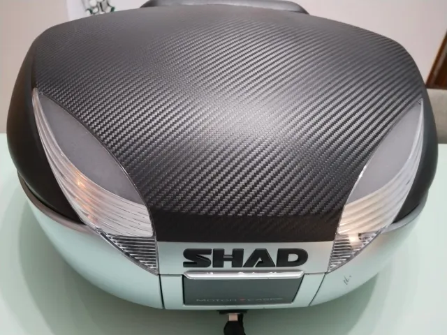Baúl para moto de la marca Shad, modelo SH48. - Diseño moderno con acabado en imitación carbono. - Incorpora luces de freno integradas. - Color plateado y negro.