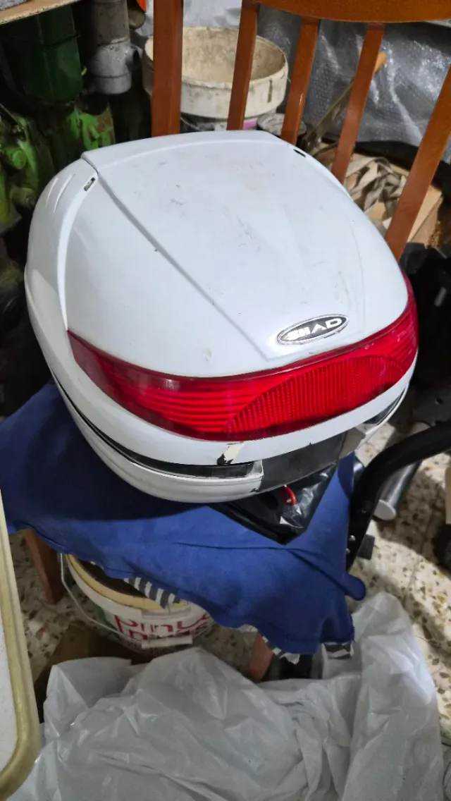 Baúl para moto de color blanco, ideal para transportar objetos. - Universal - Marca: SHAD. - Esta muy usado y arañado pero aun es usable