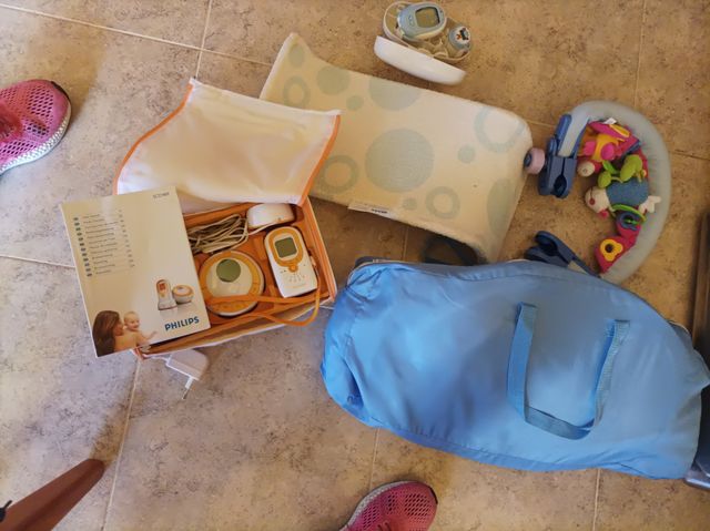 Cuna de viaje , cuida bebés Philips, animales sillita Jane, termómetro oído+chupete y tumbona bañera.