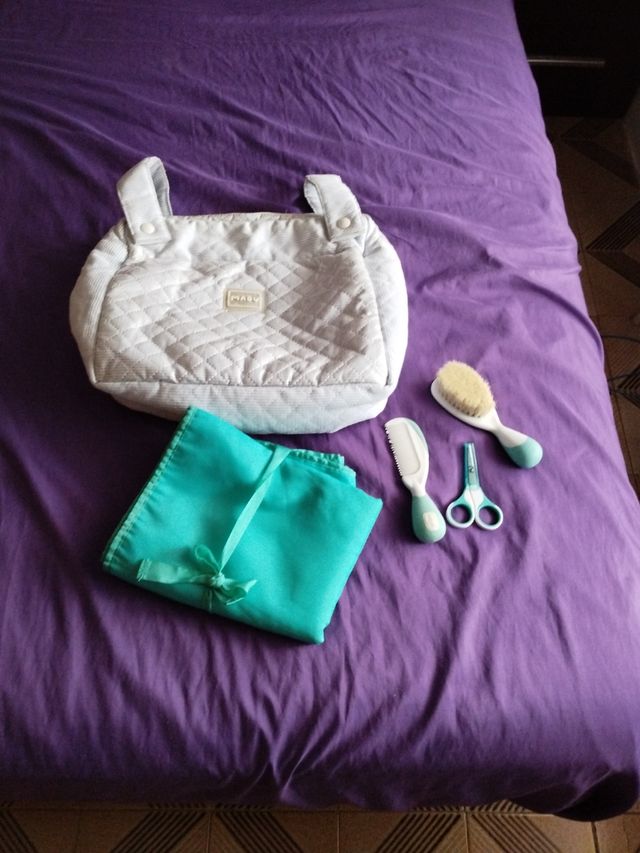 bolso panera azul celeste + cambiador verde + Cepillo y peine y tijeras todo por 5€