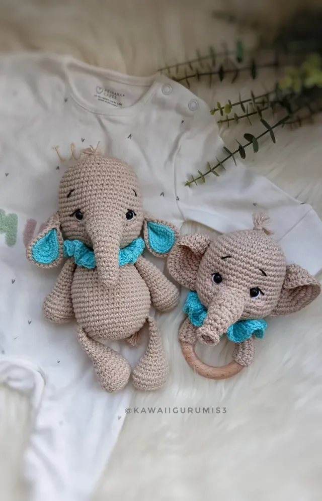 Pack bebe elefante Amigurumi y sonajero. Hechos a mano en algodón hipoalergenico para bebés. Ojos de seguridad asegurados. Aro de madera natural de haya.