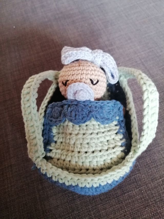 Bebé durmiendo en un moisés con almohada y mantita. Todo hecho a mano de crochet con hilo de algodón. Mide 15 cm de largo.