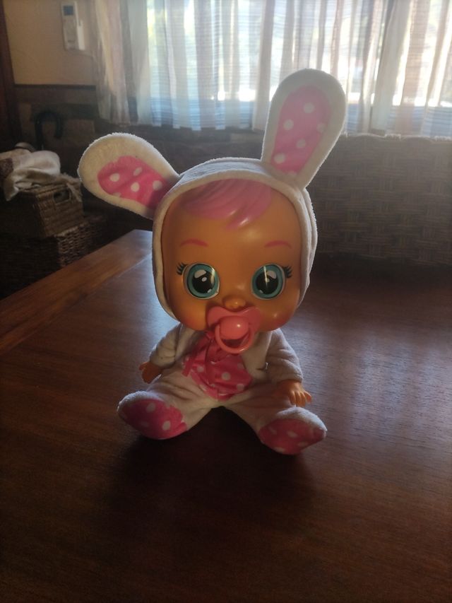Detalles del productoBebe llorón, cuando le quitas el chupe, le sale lágrimas por los ojos y se escucha llorar.Dispone de un recipiente en su interior para echarle agua, para que pueda llorar.
