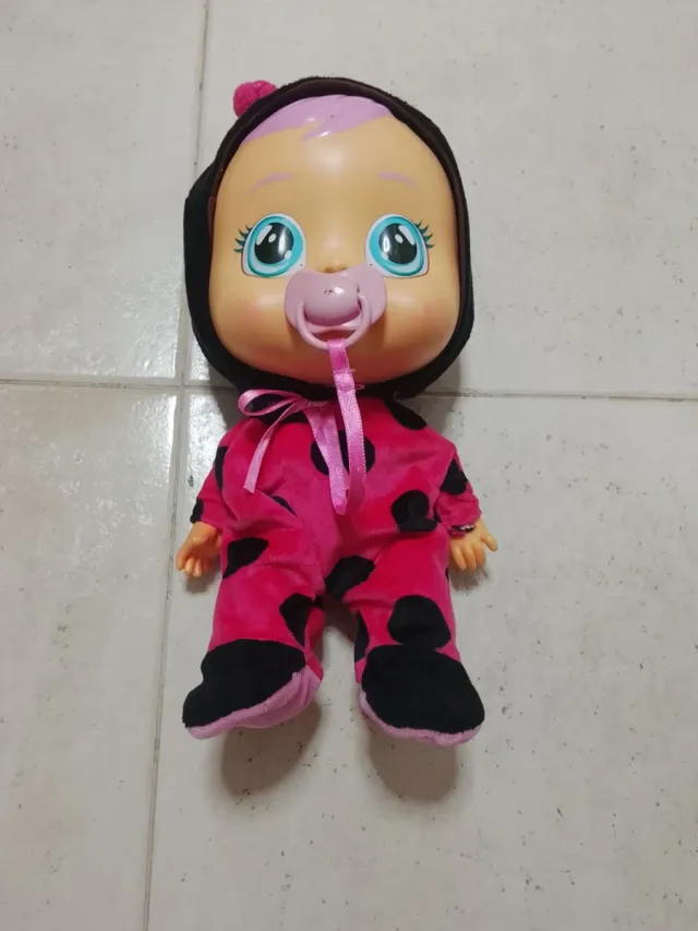 Muñeco bebé llorón con temática de mariquita. - Traje rosa con puntos negros. - Capucha negra con detalle rosa. - Chupete rosa. - Muy buen estado