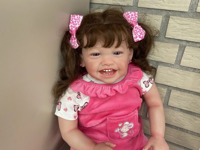 Detalles del productoPreciosa bebé reborn con sus dientecitos lo que hace su sonrisa súper real y Preciosa,pintada con pintura génesis marcando sus rojeces y venas cabeza y extremidades de vinilo ,cuerpo de tela mide 55 centímetros y pesa alrededor de los 3 kilos es súper bonita y graciosa se envía con caja pañal turbante pañal y un body y su certificado de nacimiento