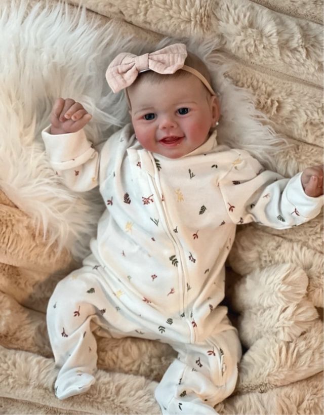 Muy realista, con movilidad y peso de un bebé. Cuerpo de tela y extremidades de vinilo.