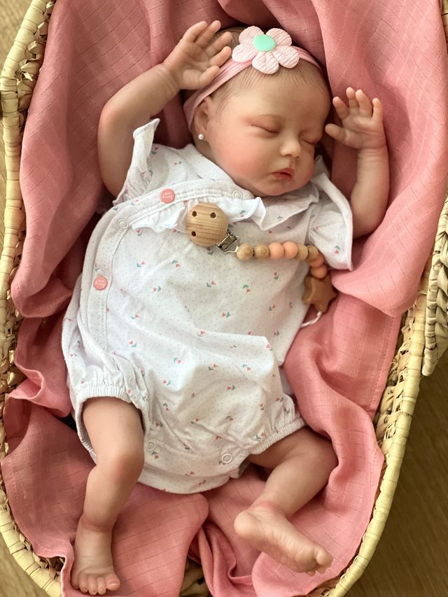 Bebé reborn de 47 cm y 1,600 kg peso. Muy realista, con movilidad y peso de un bebé. Cuerpo de tela y extremidades de vinilo.