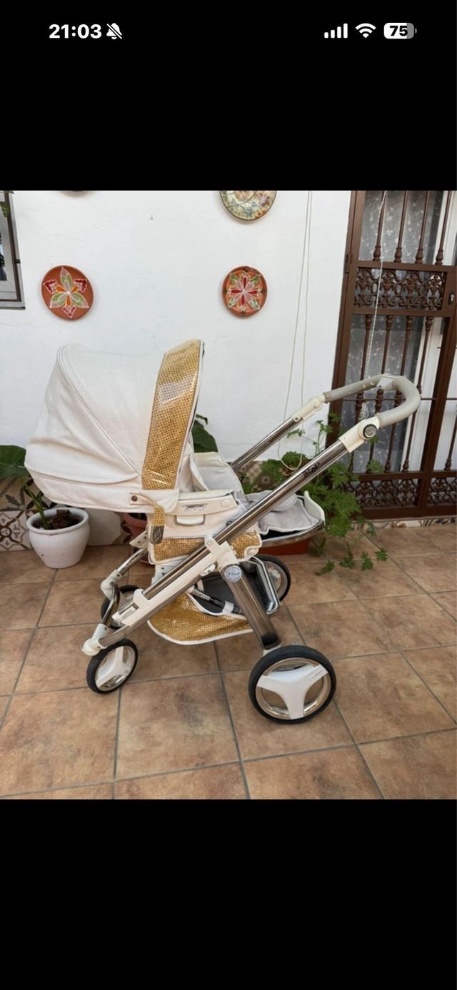 Cochecito Bebecar de edición limitada con un diseño elegante y detalles dorados. - Estructura metálica. - Capazo espacioso. - Capota con detalles brillantes.