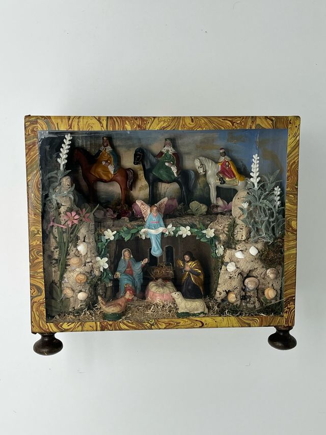 Detalles del productoEscena de belén artesanal, ideal para coleccionistas o para decorar en Navidad. Representa la natividad con figuras detalladas.
