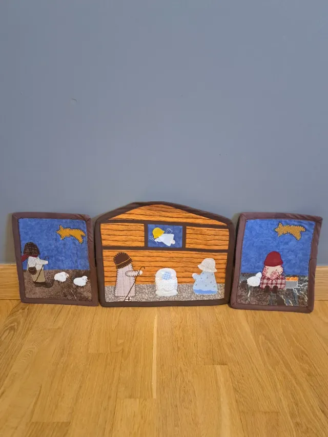 Conjunto de belén artesanal realizado con la técnica patchwork. - Figuras y portal de belén. - Diseños coloridos y detallados. - Ideal para decoración navideña.