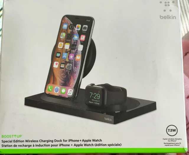 Detalles del productoEstación de carga inalámbrica Belkin BOOST↑UP para iPhone y Apple Watch. Permite cargar ambos dispositivos simultáneamente.