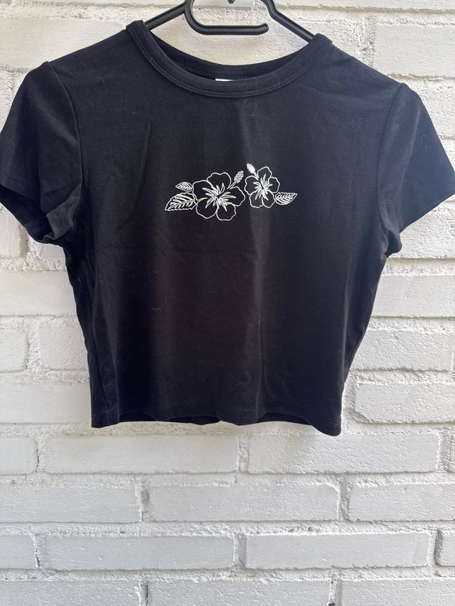 Bershka Camiseta Negra Crop Top Flores