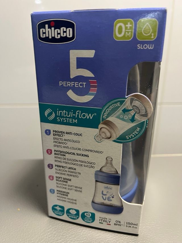 Chicco Perfect 5 Biberones Anticólicos con Tetina de Silicona de Flujo Lento para 0+ Meses, Biofuncional con Sistema Intuiflow, Color Azul, 150 ml Medidas del producto