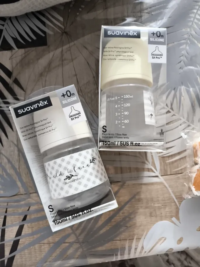 Detalles del productoDos biberones Suavinex de 150 ml con tetina de silicona de flujo lento.