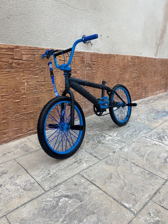Bicicleta BMX con un diseño llamativo en negro y azul. - Cuadro robusto. - Ruedas con aros azules. - Manillar azul. - Pedales azules. - negociable