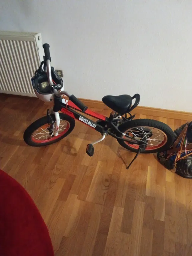 Bicicleta BMX de la marca Royalalloy, ideal para niños. - Cuadro de color rojo y negro. - Ruedas de 16 pulgadas. - Incluye casco protector.