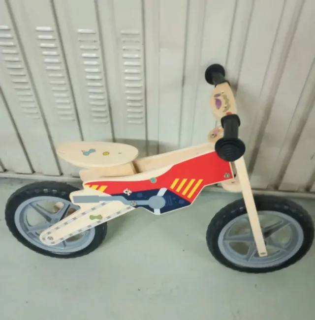 Bicicleta de equilibrio de madera, ideal para los más pequeños. - Diseño inspirado en una moto. - Ruedas de goma. - Asiento de madera. - Puños de goma negros.