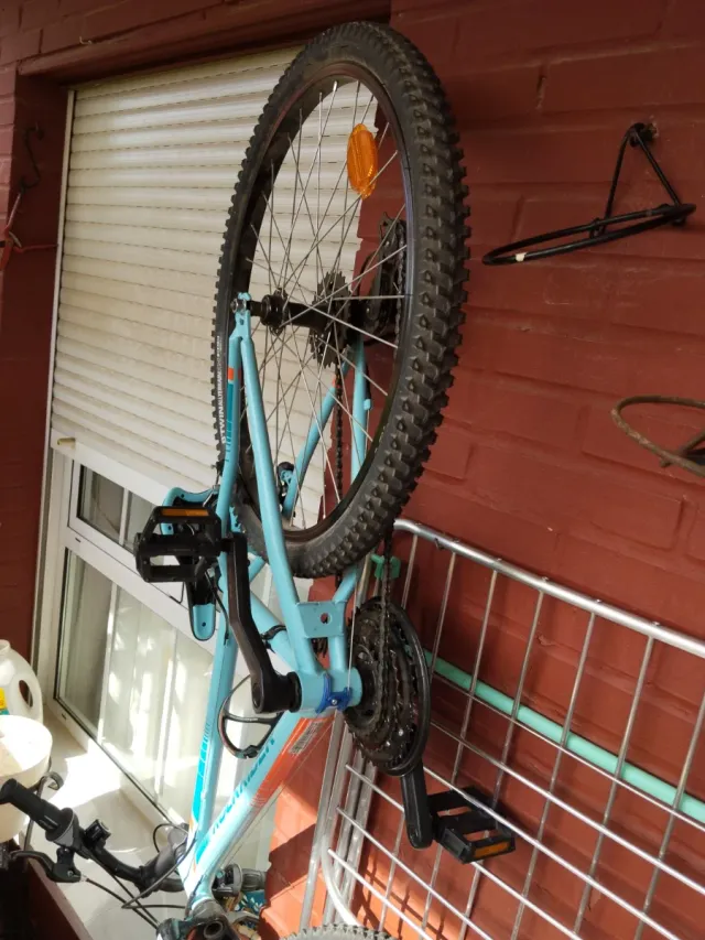 Bicicleta de montaña de color azul y naranja. - Cuadro de aluminio. - Rueda delantera de 26 pulgadas. - Frenos de disco. Las ruedas están desinfladas por falta de uso.