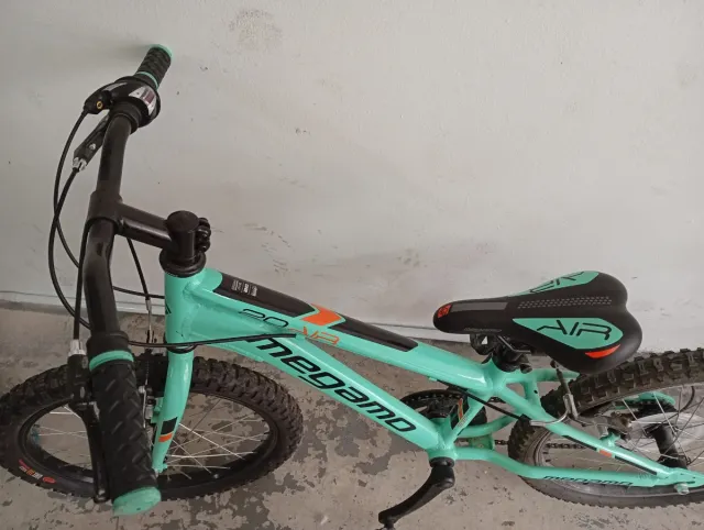 Detalles del productoBicicleta de montaña para niños con un llamativo diseño en color verde menta y detalles en naranja.