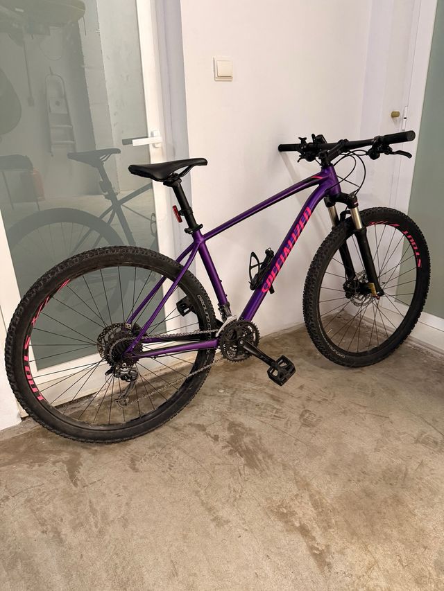 Detalles del productoBicicleta de montaña Specialized Rockhopper modelo morado rosa muy poco visto, ideal para senderos y caminos.