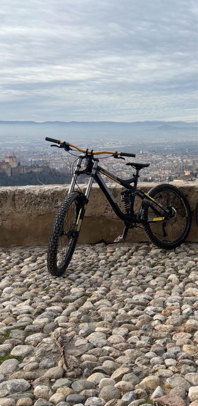 Bicicleta de descenso Mondraker Prayer. - Cuadro de doble suspensión. - Horquilla delantera. - Manillar dorado.