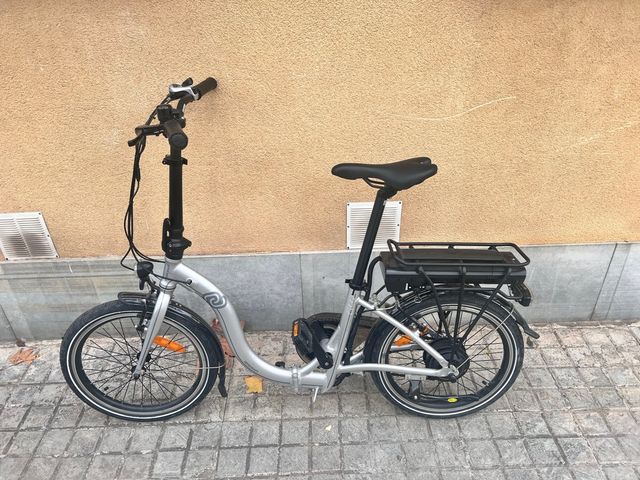 Detalles del productoBicicleta eléctrica de color plata con diseño plegable. Ideal para desplazamientos urbanos.