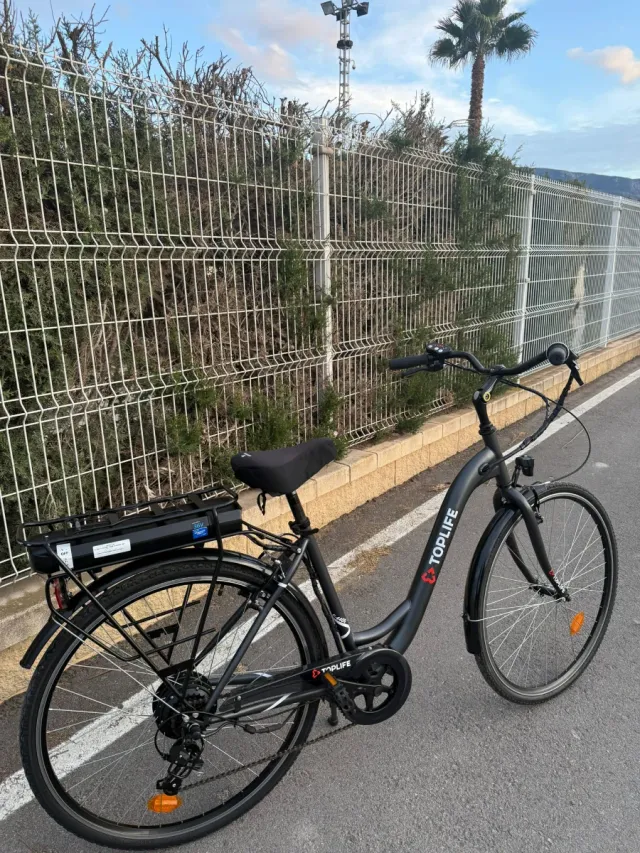 Detalles del productoBicicleta eléctrica de la marca TOPLIFE en color negro. Ideal para desplazamientos urbanos.