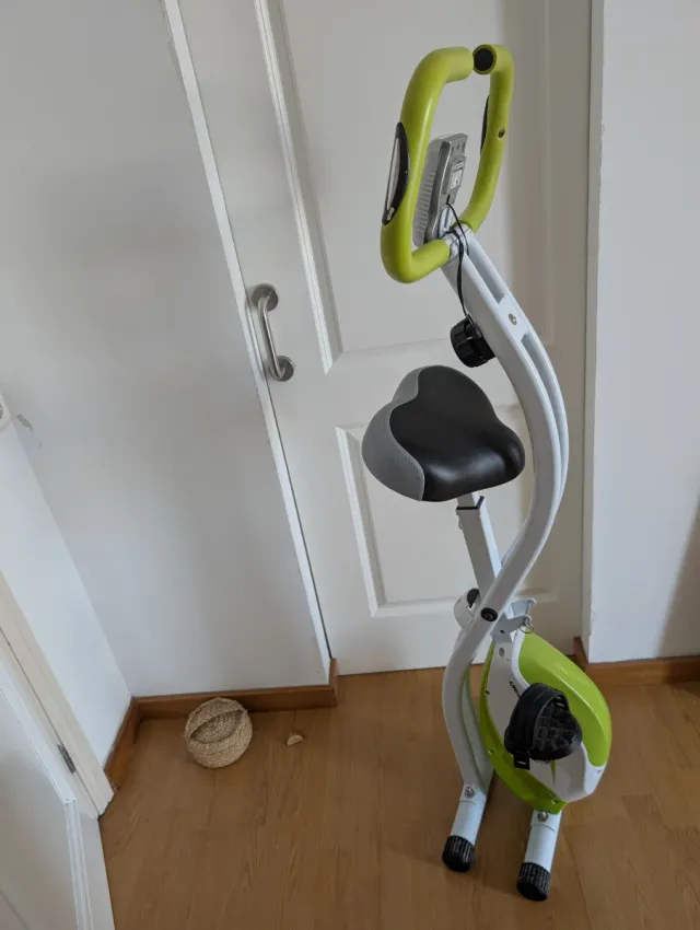 Detalles del productoBicicleta estática plegable, ideal para entrenar en casa. Su diseño permite guardarla fácilmente. Tiene una correa de plástico del pedal rota y le faltan pilas al control si se quieren ver las calorías.
