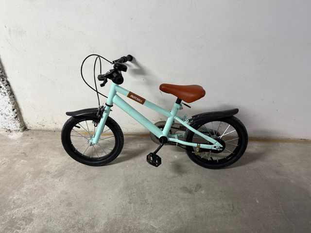 Bicicleta infantil de 14 pulgadas. - Color menta. - Sillín marrón. - Guardabarros delantero y trasero. Se vende con accesorios: cesta, infladora y ruedines.