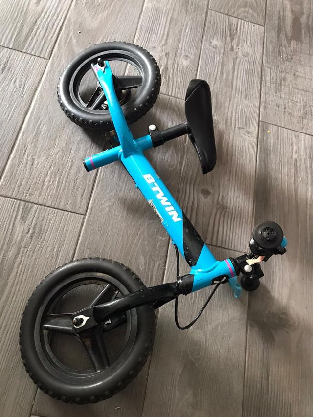 Bicicleta de aprendizaje Btwin en color azul. - Ruedas de goma. - Sillín ajustable. - Timbre incluido.