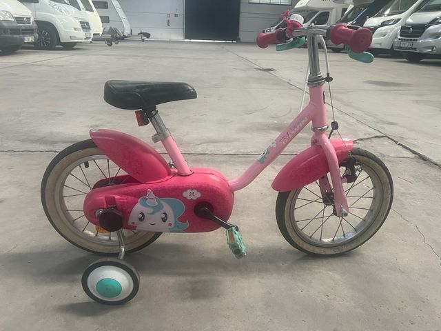 Bicicleta infantil de color rosa, ideal para aprender a montar. - Diseño con unicornio. - Ruedines incluidos. - Manillar con puños de colores.