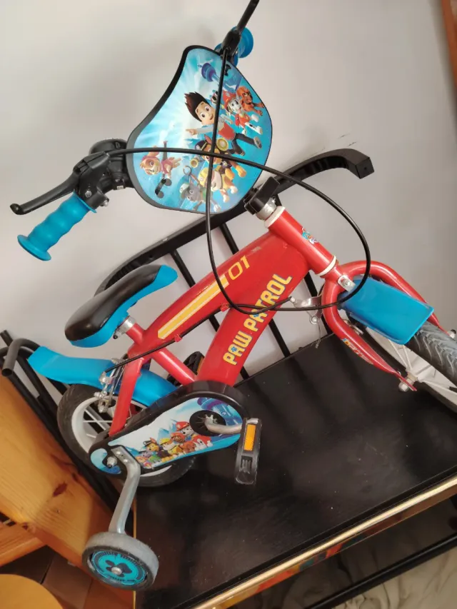 Bicicleta infantil con diseño de Patrulla Canina. - Color principal rojo. - Ruedines de apoyo incluidos. - Manillar con puños azules y protector decorado.