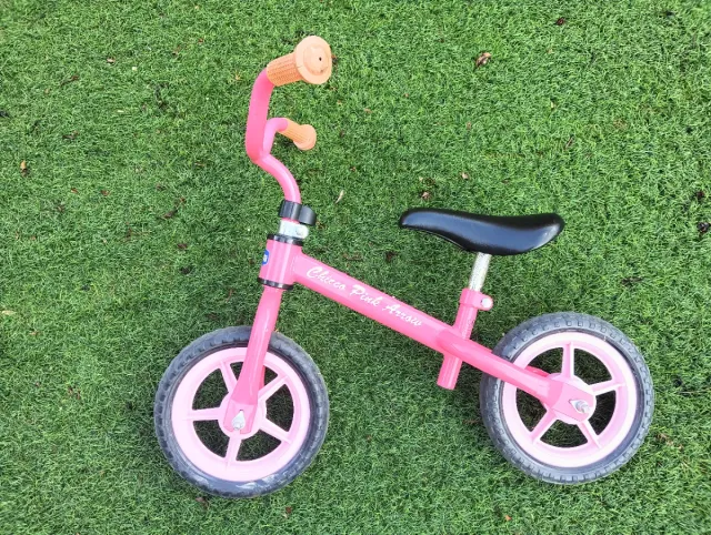 Bicicleta de aprendizaje Chicco en color rosa. - Diseño ligero y manejable. - Ruedas de goma. - Puños de goma para un mejor agarre.