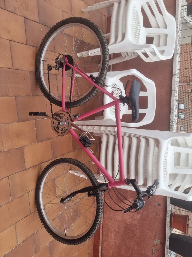 Detalles del productoLa bici a sido pintada de rosa y negra despues se aplico laca protectora tiene corona de siete atras y tres alante sillin blandito las ruedas estan al 80 poco rodadas los frenos son medio nuevos frena genial chasis de hierro esta revisada se puede ver y probar Medidas del producto