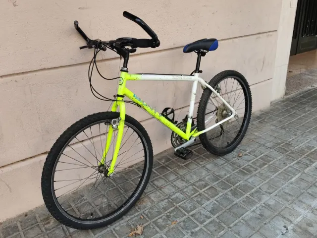 Detalles del productoBicicleta de montaña con un diseño llamativo en colores blanco y verde lima.