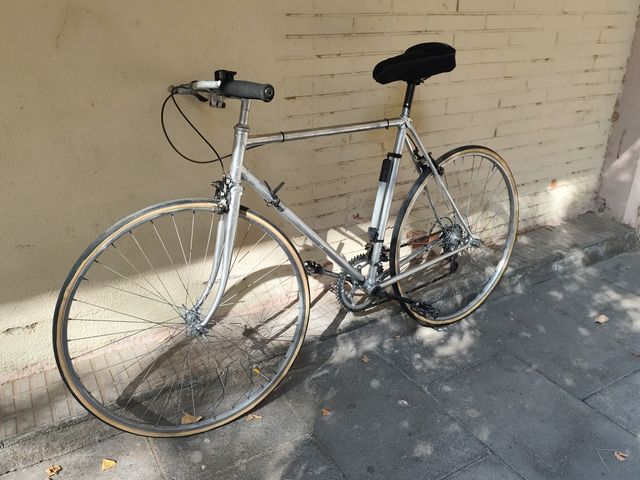 Bicicleta de carretera con un diseño clásico y elegante. - talla M para 1.65 a 1.75 cm. - Cuadro de metal plateado. - Ruedas de 28 pulgadas - Sillín negro. - Manillar de carreteras