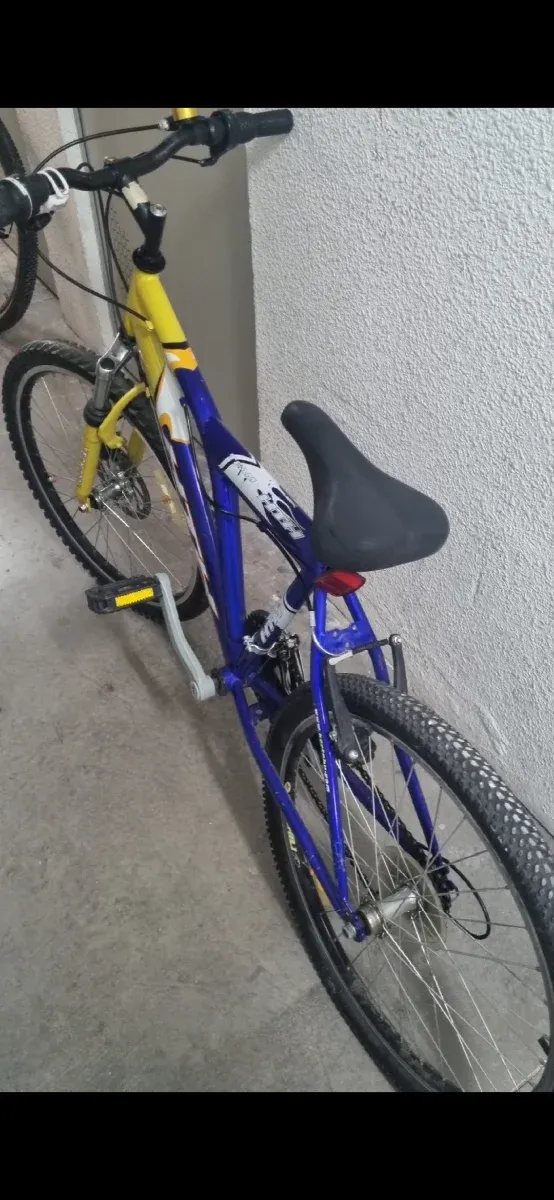 Bicicleta de montaña con un llamativo diseño en azul y amarillo. - Ruedas de 22 pulgadas. - Sillín negro. - Pedales grises.