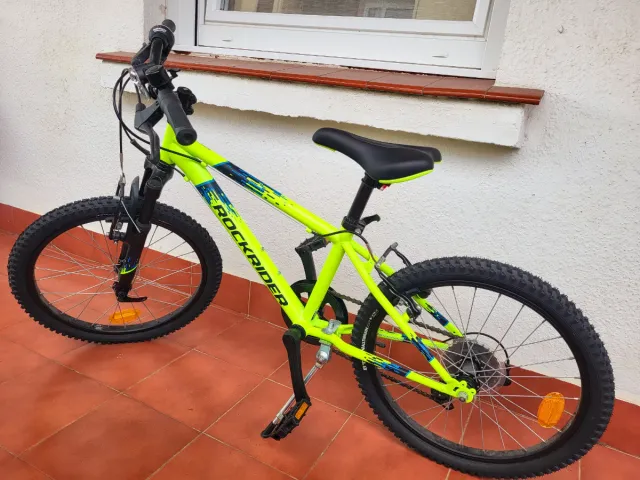 Detalles del productoBicicleta Rockrider de 20 pulgadas en color neón, ideal para jóvenes ciclistas con cambios en el manillar.