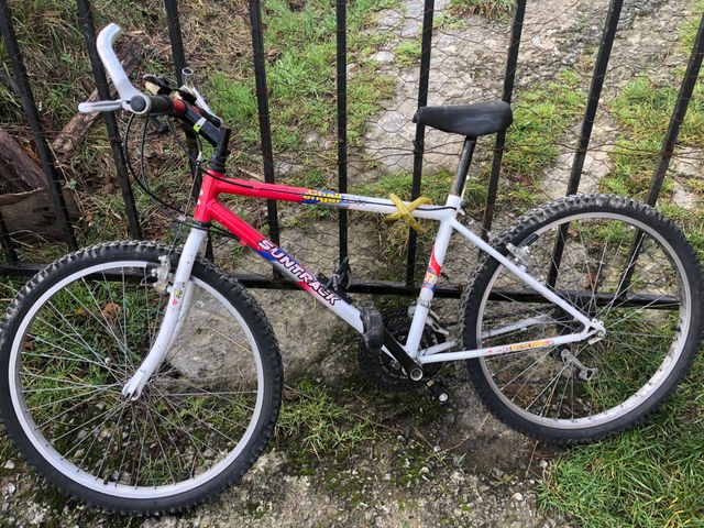 Bicicleta de montaña SUNTRACK con ruedas de 24 pulgadas. - Cuadro de color rojo y blanco. - Manillar plateado. - Sillín negro.