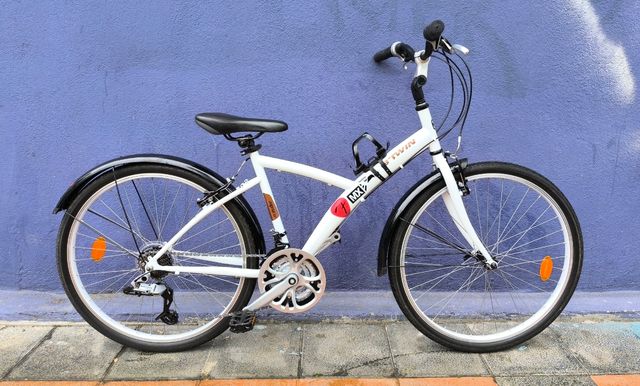 Bicicleta de 26 pulgadas, ideal para mujer y en estado nuevo. - Cuadro blanco. - Ruedas con guardabarros. - Incluye portabidón.