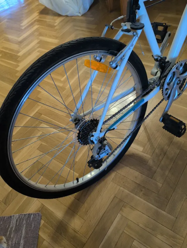 Bicicleta de adulto con sistema de marchas. - Cuadro de color blanco. - Rueda trasera con piñones. - Frenos delanteros y traseros.