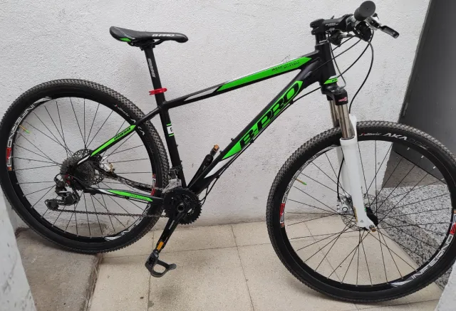 Bicicleta B-PRO 950 en color negro y verde. Muy poco uso. - Cuadro de aluminio. - Ruedas de 29 pulgadas. - Frenos de disco. - Suspensión delantera.