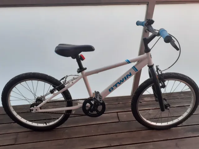 Bicicleta infantil B-Twin de 20 pulgadas. - Color blanco con detalles en azul. - Sillín negro. - Puños de manillar azules.