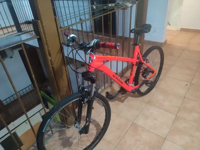 Bicicleta B'TWIN de color naranja, ideal para paseos. - Cuadro de aluminio. - Ruedas de 24 pulgadas. - Suspensión delantera. Puesta a punto recientemente
