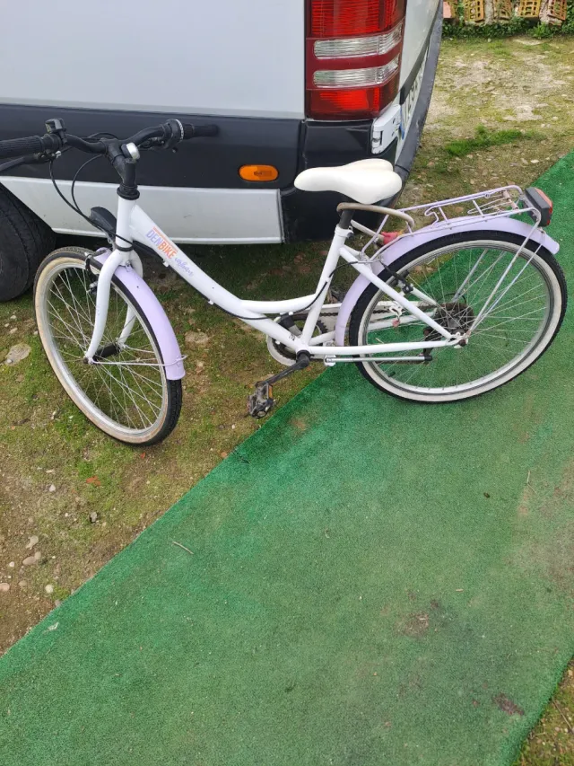 Detalles del productoBicicleta urbana de color blanco con detalles en lila.