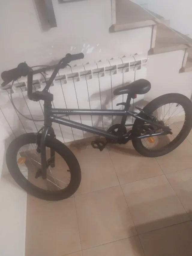 Bicicleta BMX de color gris, ideal para trucos y diversión. - Cuadro resistente. - Ruedas anchas para mayor estabilidad. - Manillar giratorio.