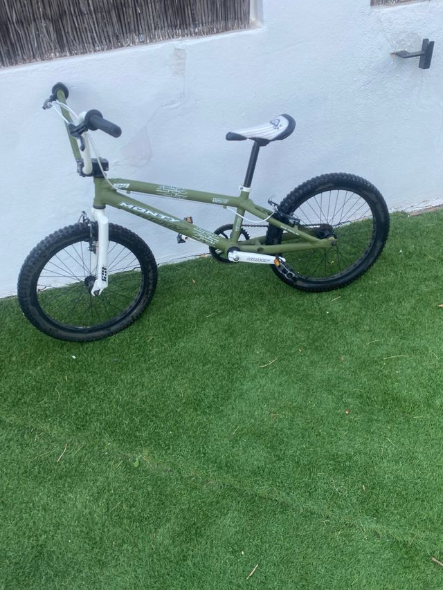 Bicicleta BMX de la marca Monty en color verde y blanco. Ideal para trucos paseos y montaña. - Cuadro de BMX. - Ruedas de 20 pulgadas todoterreno. - Frenos.