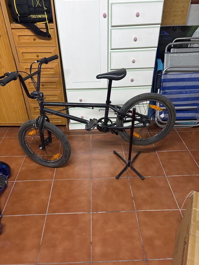 Bicicleta BMX de color negro, lista para usar. - Ruedas de 20 pulgadas. - Manillar giratorio. - Pedales de plataforma.